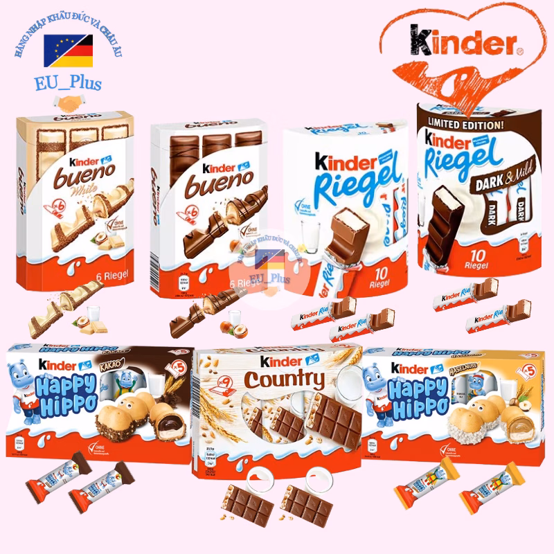 Socola Kinder Bueno nhân hạt dẻ, Kinder Cards và Kinder Happy Hippo là những sản phẩm đến từ Đức, nổi tiếng với chất lượng cao và hương vị đặc trưng. Tuy nhiên, để đảm bảo chất lượng tốt nhất, bạn cần kiểm tra hạn sử dụng trước khi mua.