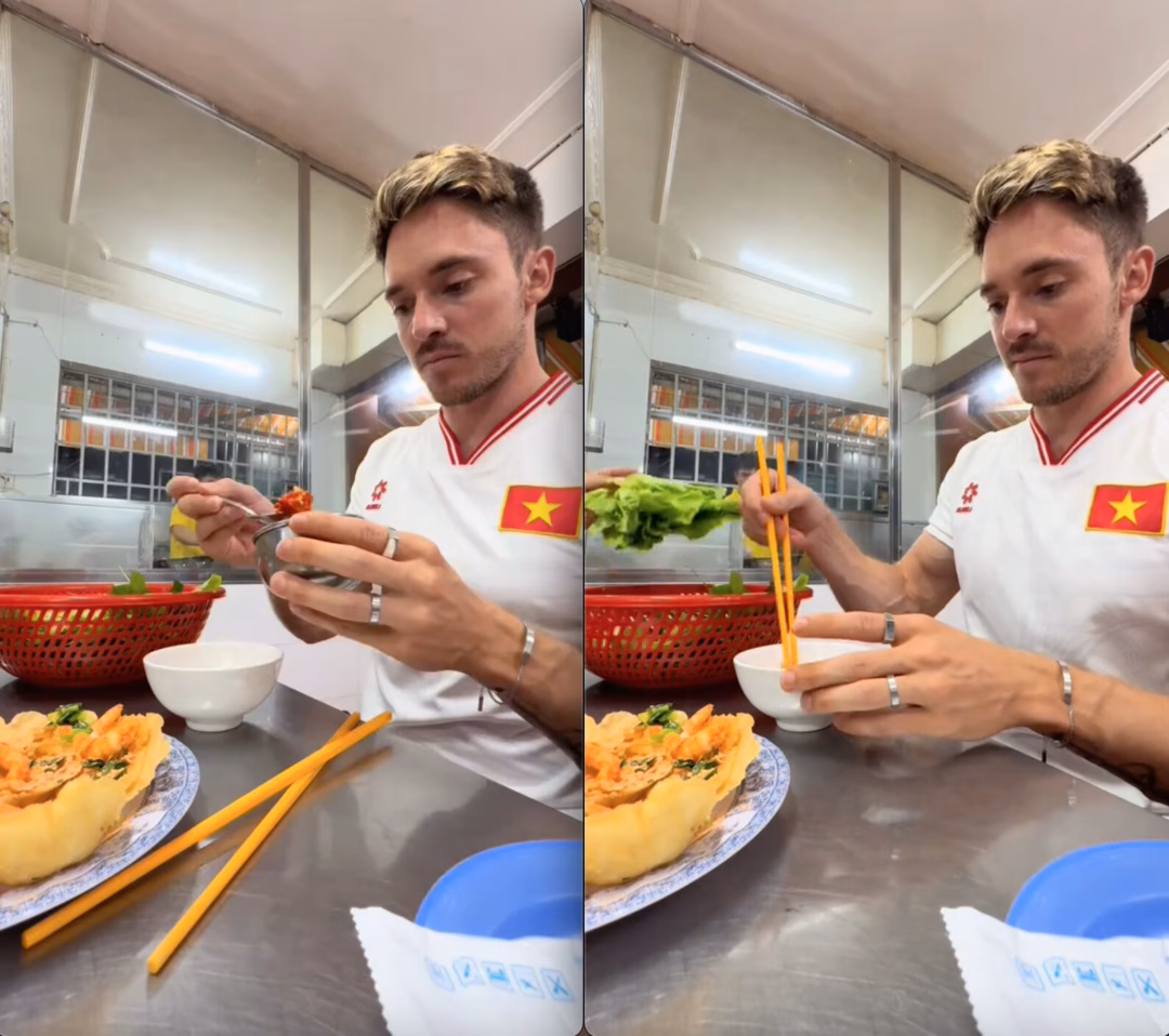 Sự kết hợp độc đáo này đã tạo nên một trải nghiệm ẩm thực đầy cuốn hút. Qua cách anh chàng tận hưởng từng miếng bánh giòn rụm, có thể thấy ẩm thực Việt không chỉ phong phú mà còn mang một sức hút rất riêng – một thứ cảm xúc khó diễn tả bằng lời, chỉ có thể cảm nhận bằng vị giác và trái tim.