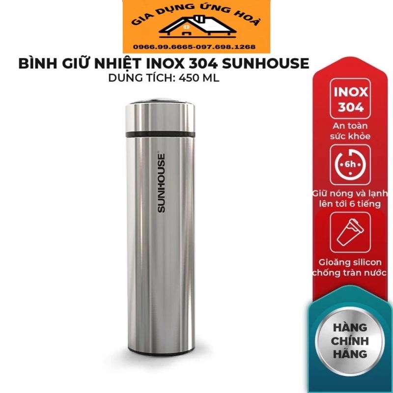 Bình giữ nhiệt SUNHOUSE 450ml được làm từ thép không gỉ cao cấp, có khả năng giữ nhiệt độ ổn định trong thời gian dài. Sản phẩm này cũng có thiết kế đẹp mắt và phong cách, dễ dàng mang theo và sử dụng.