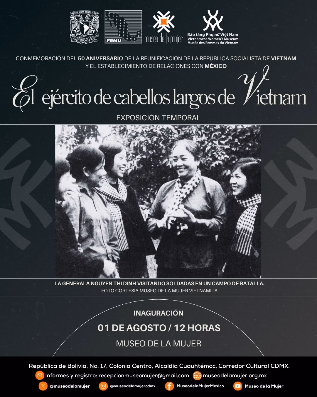 Ngày 30/4/1975 – một dấu mốc lịch sử quan trọng trong quá trình đấu tranh giành độc lập của dân tộc Việt Nam đã để lại nhiều ấn tượng sâu sắc. Để kỷ niệm 50 năm Chiến thắng lịch sử này và 50 năm thiết lập quan hệ ngoại giao giữa Việt Nam và Mexico, Bảo tàng Phụ nữ Mexico (Museo de la Mujer) và Bảo tàng Phụ nữ Việt Nam đã phối hợp tổ chức triển lãm ‘Đội quân tóc dài’. Sự kiện này đã diễn ra trong không khí trang trọng với sự tham gia của Đại sứ Việt Nam tại Mexico, Nguyễn Văn Hải; đại diện từ các bộ, ngành văn hóa và ngoại giao của Mexico; cùng các nhà báo và học giả đến từ Đại học Tự trị Quốc gia Mexico (UNAM) và Liên đoàn Đại học Phụ nữ Mexico (FEMU).